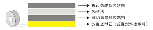 采用柔軟PE泡棉,兩面涂以丙烯酸高分子膠粘劑,具有良好的粘合性能。